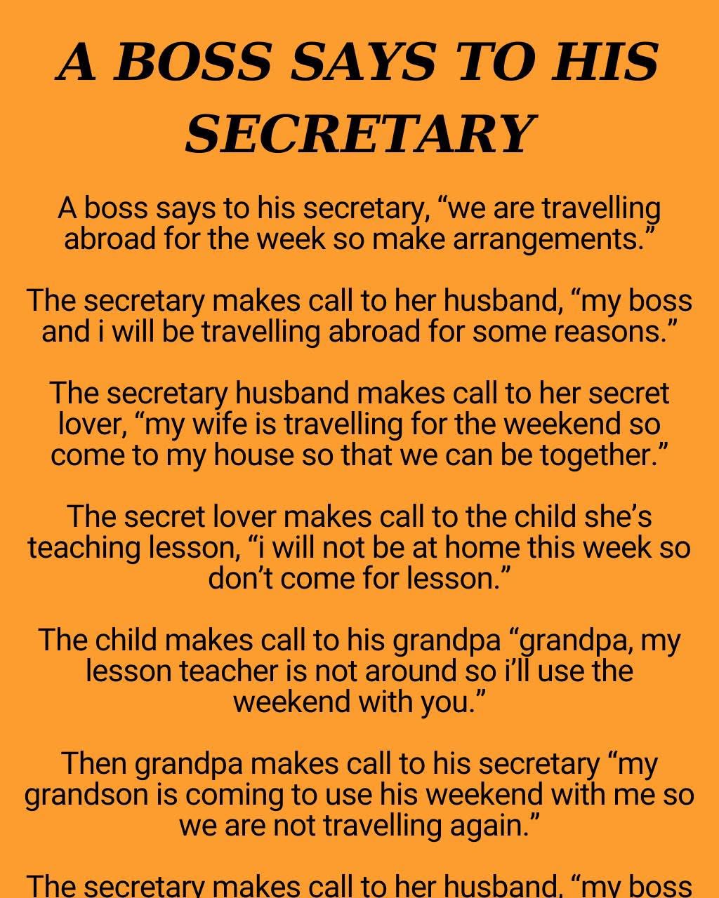 The secretary makes call to her husband, “my boss said his grandson is coming to use weekend with him, so our trip is cancelled.”